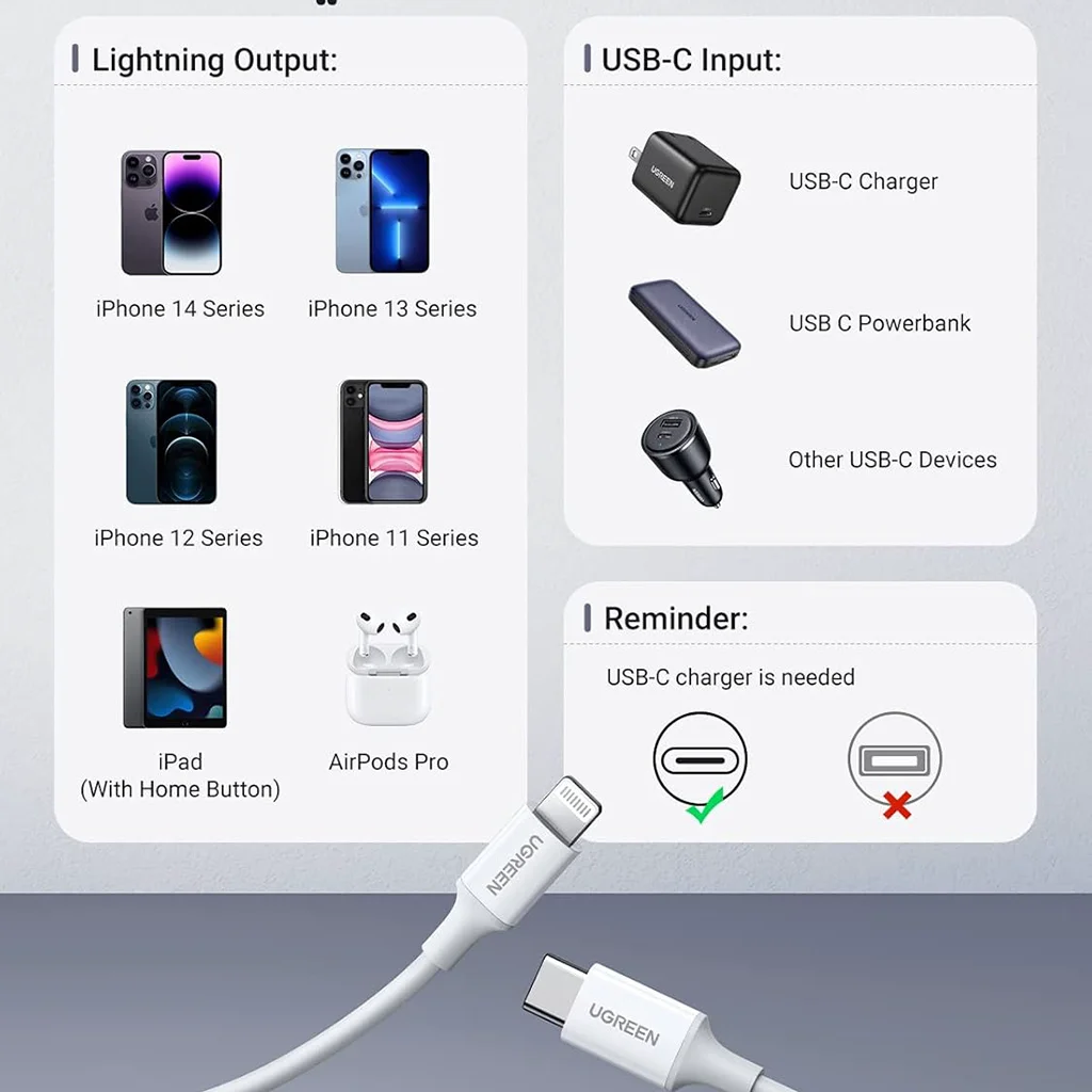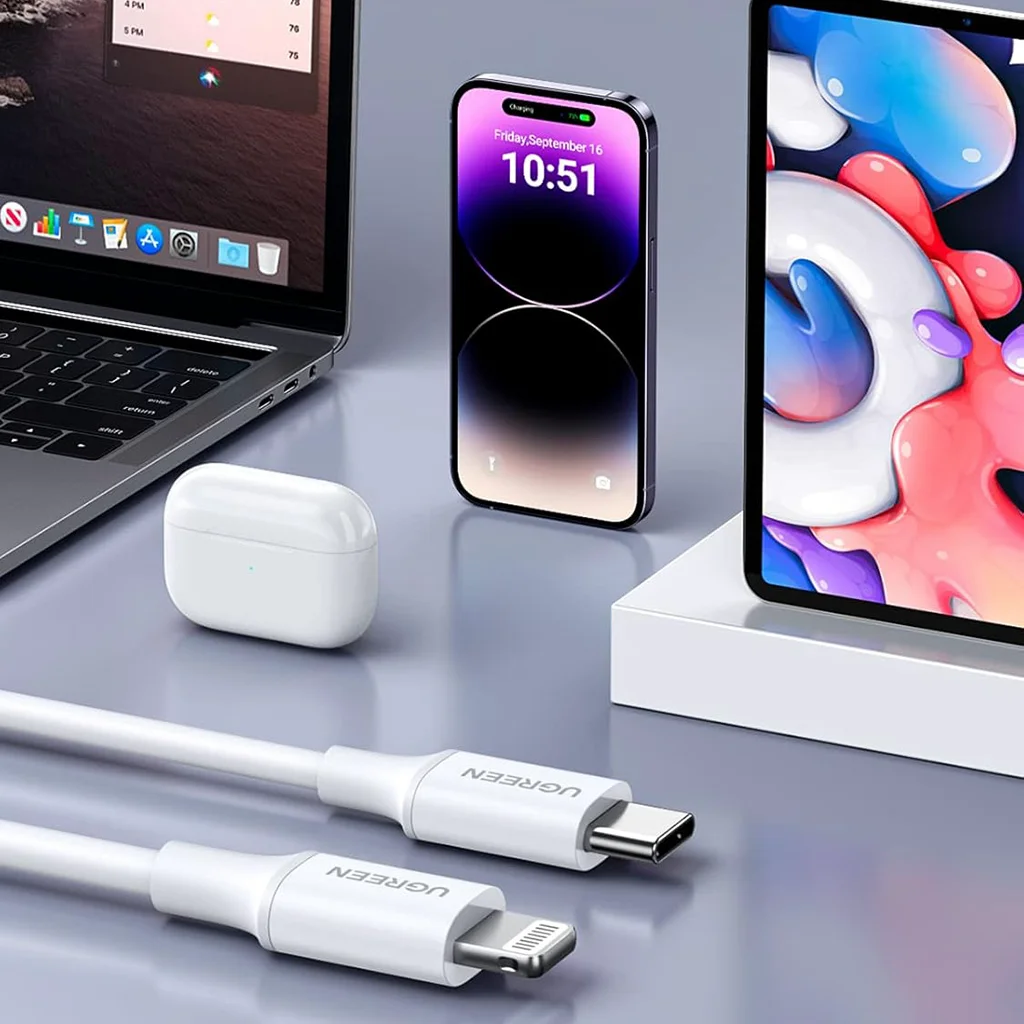 The UGREEN 10493 USB-C to Lightning cable is officially MFi-certified, ensuring full compatibility with Apple devices and safe charging at optimal speeds. Built with durable materials and reinforced connectors, this cable supports USB-C Power Delivery for fast charging of iPhone and iPad models. With its compact 1-meter length, it is ideal for everyday use—at home, in the office, in the car, or during travel. Delivering reliable and consistent performance, this cable is a trusted choice for Apple users seeking durability and safety.